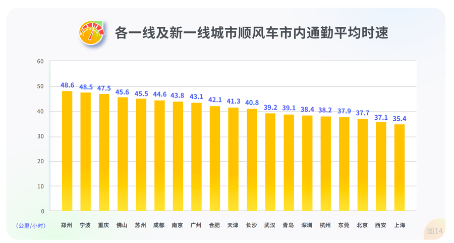 各一线及新一线城市顺风车市内通勤平均时速,最快前五依次是郑州48.6公里、宁波48.5公里、重庆47.5公里、佛山45.6公里和苏州45.5公里。