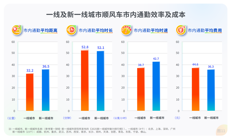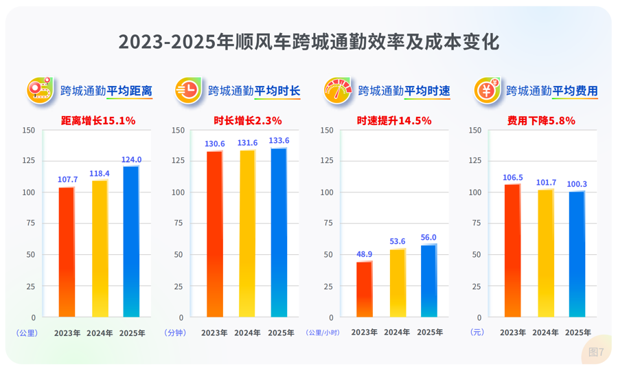 顺风车跨城通勤平均距离从107.7公里增至124公里,平均时长从130.6分钟微增至133.6分钟,但平均时速从48.9公里大幅提升至56公里,增幅达14.5%。