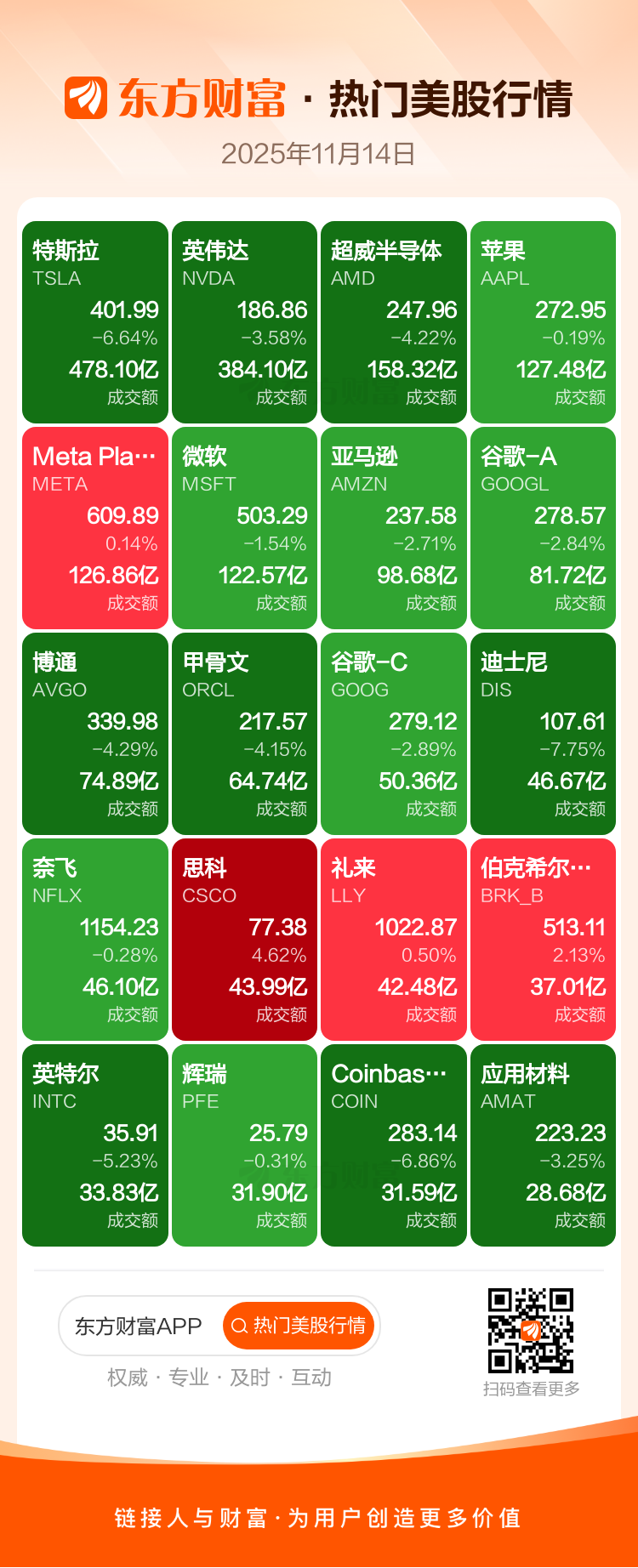 特斯拉跌6.64%,英伟达跌3.58%,超威半导体跌4.22%,苹果跌0.19%,Meta Platforms Inc-A涨0.14%,微软跌1.54%,亚马逊跌2.71%,谷歌-A跌2.84%,博通跌4.29%,甲骨文跌4.15%。
