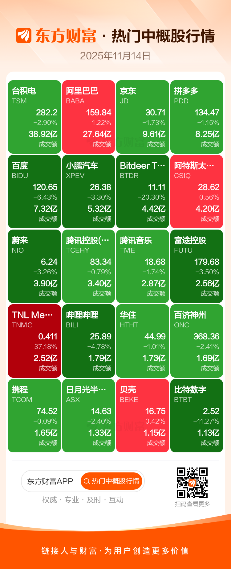 台积电跌2.90%,阿里巴巴涨1.22%,京东跌1.73%,拼多多跌1.15%,百度跌6.43%,小鹏汽车跌3.30%,Bitdeer Technologies Group-A跌20.30%,阿特斯太阳能涨0.56%,蔚来跌3.26%,腾讯控股(ADR)跌0.79%。