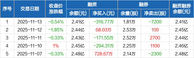 融资方面,当日融资买入676.12万元,融资偿还992.89万元,融资净偿还316.77万元。融券方面,融券卖出0股,融券偿还7200股,融券余量1.81万股,融券余额26.68万元。融资融券余额合计2.41亿元。