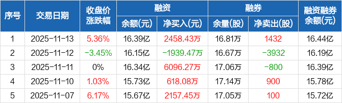 融资方面,当日融资买入2.51亿元,融资偿还2.27亿元,融资净买入2458.43万元。融券方面,融券卖出3032股,融券偿还1600股,融券余量16.81万股,融券余额505.28万元。融资融券余额合计16.44亿元。