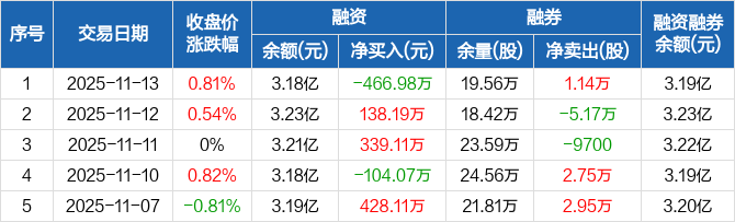 融资方面,当日融资买入3518.07万元,融资偿还3985.05万元,融资净偿还466.98万元。融券方面,融券卖出1.43万股,融券偿还2900股,融券余量19.56万股,融券余额73.35万元。融资融券余额合计3.19亿元。