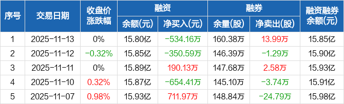 融资方面,当日融资买入1.01亿元,融资偿还1.06亿元,融资净偿还534.16万元。融券方面,融券卖出14.15万股,融券偿还1600股,融券余量160.38万股,融券余额495.57万元。融资融券余额合计15.85亿元。