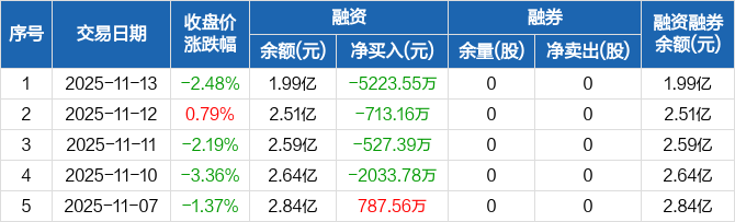 融资方面,当日融资买入3525.55万元,融资偿还8749.1万元,融资净偿还5223.55万元,连续4日净偿还累计8497.89万元。融券方面,融券卖出0股,融券偿还0股,融券余量0股,融券余额0元。融资融券余额合计1.99亿元。