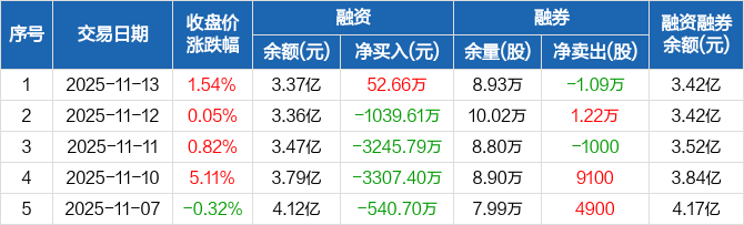 融资方面,当日融资买入1829.73万元,融资偿还1777.07万元,融资净买入52.66万元。融券方面,融券卖出2000股,融券偿还1.29万股,融券余量8.93万股,融券余额534.19万元。融资融券余额合计3.42亿元。