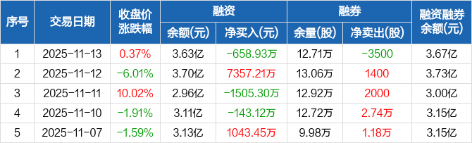 融资方面,当日融资买入7212.84万元,融资偿还7871.77万元,融资净偿还658.93万元。融券方面,融券卖出2600股,融券偿还6100股,融券余量12.71万股,融券余额345.08万元。融资融券余额合计3.67亿元。