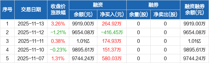 融资方面,当日融资买入1352.52万元,融资偿还1087.6万元,融资净买入264.92万元。融券方面,融券卖出0股,融券偿还0股,融券余量0股,融券余额0元。融资融券余额合计9919万元。