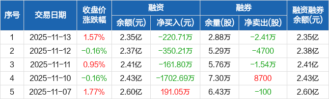 金能科技融资融券信息显示,2025年11月13日融资净偿还220.71万元;融资余额2.35亿元,较前一日下降0.93%