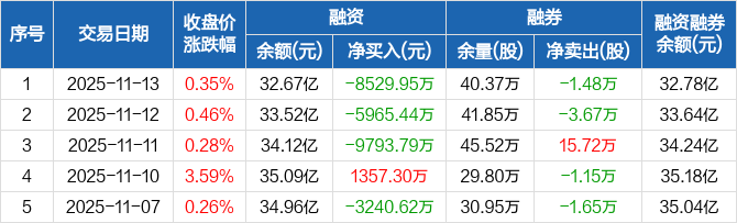 伊利股份融资融券信息显示,2025年11月13日融资净偿还8529.95万元;融资余额32.67亿元,较前一日下降2.54%