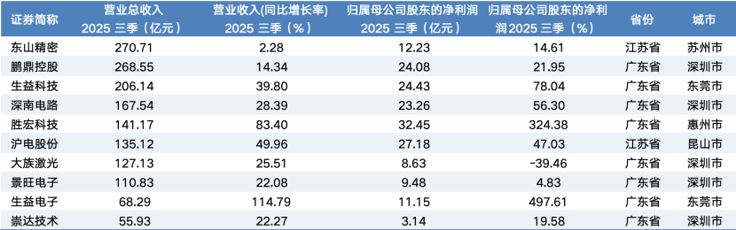从板块统计来看,在2025年第三季度总营收规模前10的企业中,广东企业拥有8家,包括鹏鼎控股(268.55亿元)、生益科技(206.14亿元)、深南电路(167.54亿元)等巨头。更令人瞩目的是增长质量上的优势。在营收增速方面,生益电子以114.79%的增幅领跑全行业,胜宏科技以83.40%紧随其后;在关键指标归母净利润增速上,生益电子与胜宏科技以几百倍的增长率表现瞩目。这种规模与利润的双重领先,充分证明了广东PCB产业在技术创新、市场响应和成本控制上的全方位优势。