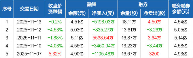 融资方面,当日融资买入9339.45万元,融资偿还1.45亿元,融资净偿还5198.03万元,净偿还额创历史新高。融券方面,融券卖出4.54万股,融券偿还400股,融券余量18.11万股,融券余额270.38万元。融资融券余额合计4.54亿元。