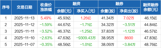融资方面,当日融资买入7.26亿元,融资偿还6亿元,融资净买入1.26亿元。融券方面,融券卖出9.88万股,融券偿还2.86万股,融券余量41.34万股,融券余额2162.08万元。融资融券余额合计46.15亿元。