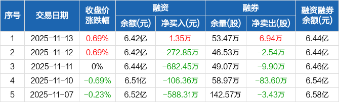 融资方面,当日融资买入1812.3万元,融资偿还1810.95万元,融资净买入1.35万元。融券方面,融券卖出8.36万股,融券偿还1.42万股,融券余量53.47万股,融券余额234.2万元。融资融券余额合计6.44亿元。
