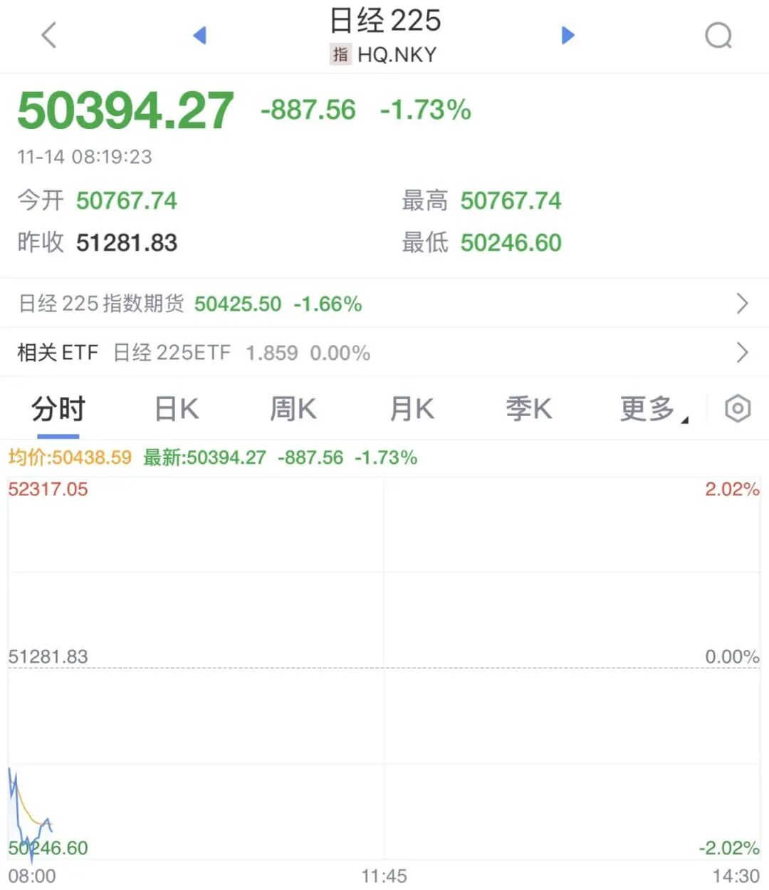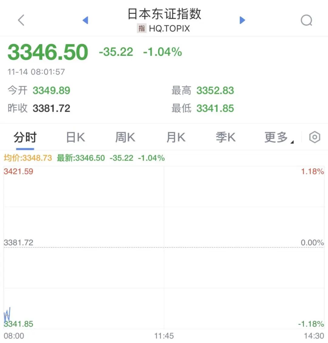 日经225指数跌幅扩大至2%,日本东证指数跌超1%。