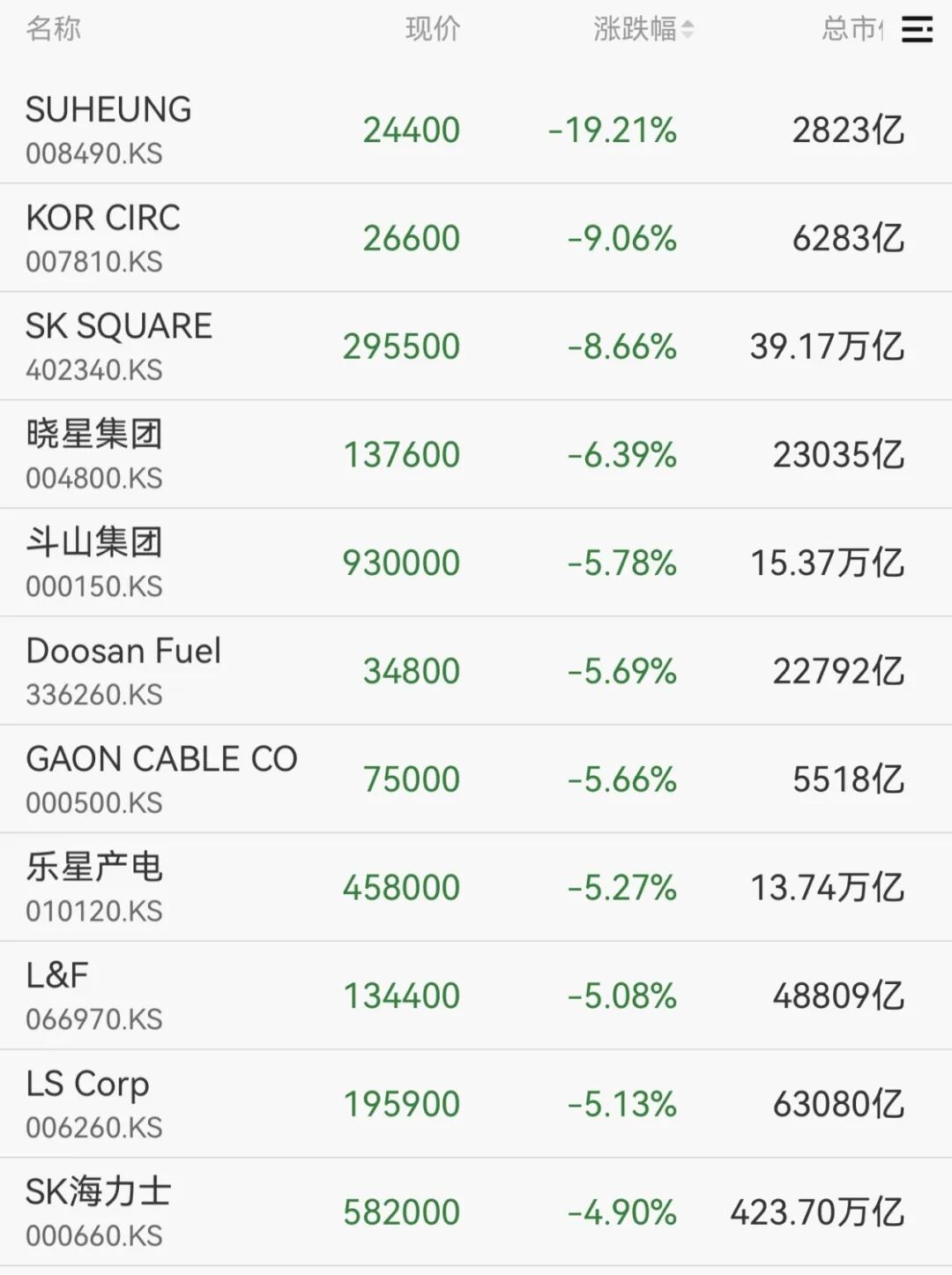权重股方面,三星电子、SK海力士、LG新能源均有较大跌幅。