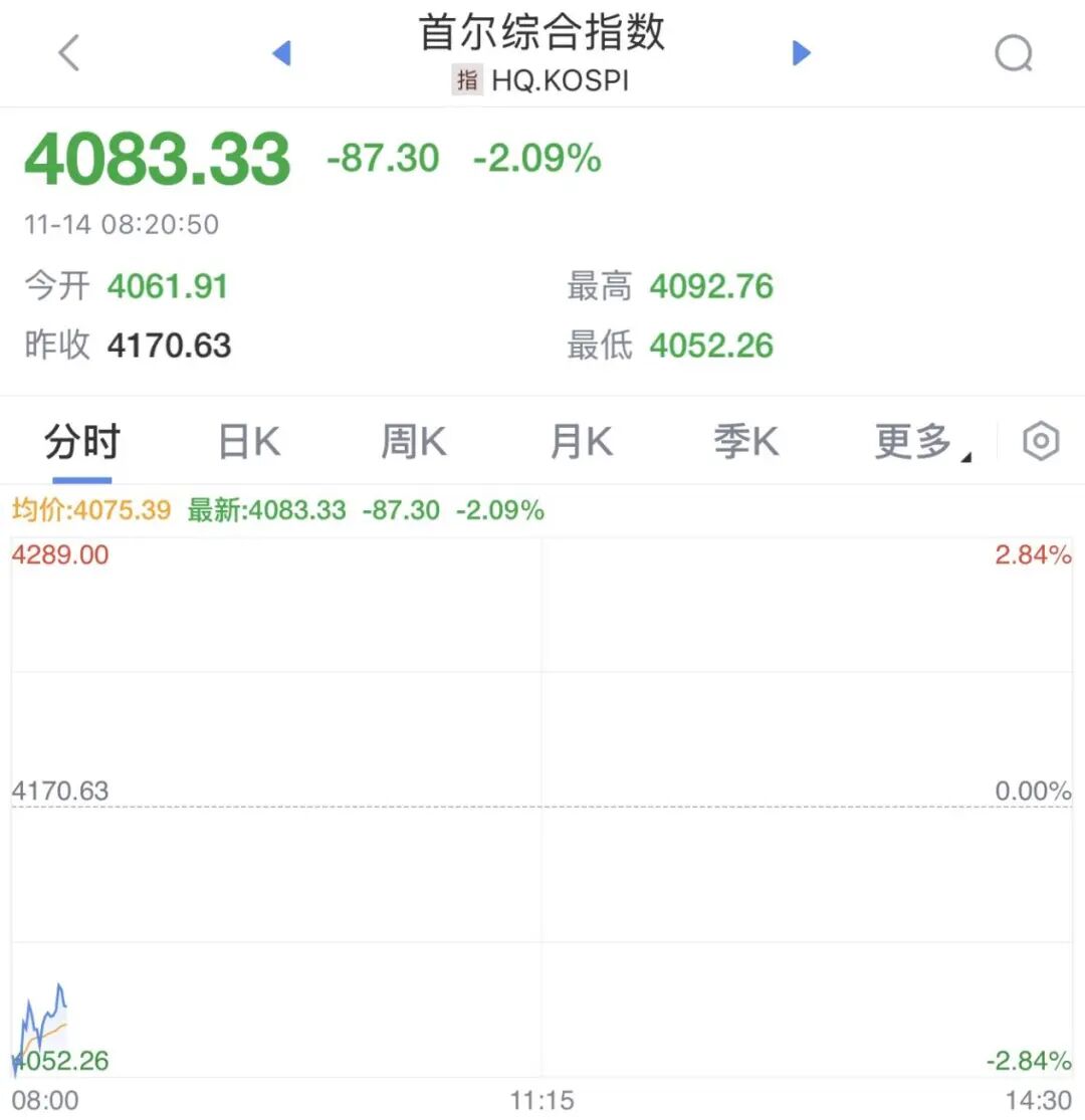 11月14日,韩国综合指数开盘一度跌超2.8%,随后震荡拉升。