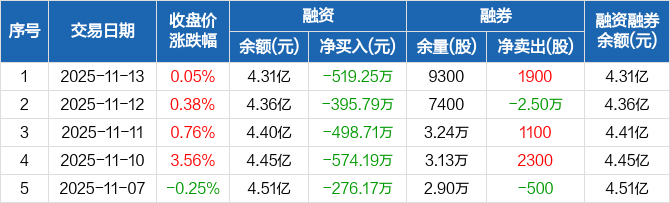 融资方面,当日融资买入4436.05万元,融资偿还4955.3万元,融资净偿还519.25万元,连续5日净偿还累计2264.11万元。融券方面,融券卖出2100股,融券偿还200股,融券余量9300股,融券余额19.72万元。融资融券余额合计4.31亿元。