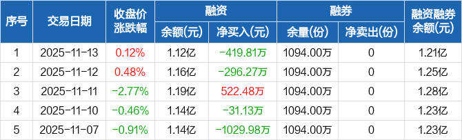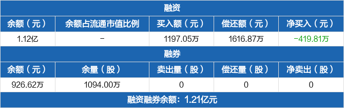 融资方面,当日融资买入1197.05万元,融资偿还1616.87万元,融资净偿还419.81万元。融券方面,融券卖出0份,融券偿还0份,融券余量1094万份,融券余额926.62万元。融资融券余额合计1.21亿元。