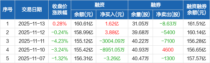 胜宏科技融资融券信息显示,2025年11月13日融资净买入1.62亿元;融资余额160.61亿元,较前一日增加1.02%。