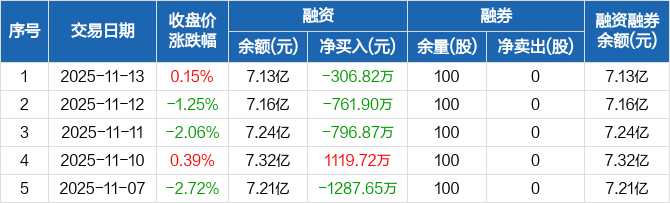 融资方面,当日融资买入4318万元,融资偿还4624.82万元,融资净偿还306.82万元,连续3日净偿还累计1865.6万元。融券方面,融券卖出0股,融券偿还0股,融券余量100股,融券余额1979元。融资融券余额合计7.13亿元。
