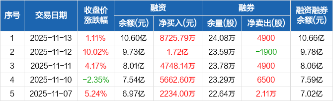 融资方面,当日融资买入4.4亿元,融资偿还3.53亿元,融资净买入8725.79万元,连续7日净买入累计4.53亿元。融券方面,融券卖出5100股,融券偿还200股,融券余量24.08万股,融券余额569.25万元。融资融券余额合计10.66亿元。
