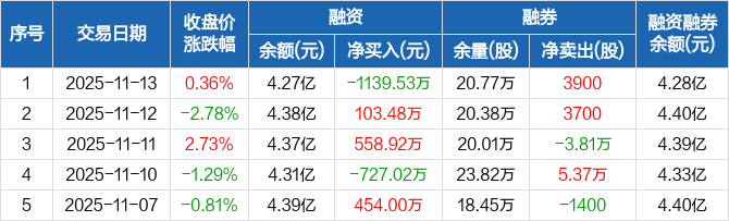 苏交科融资融券信息显示,2025年11月13日融资净偿还1139.53万元;融资余额4.27亿元,较前一日下降2.6%。