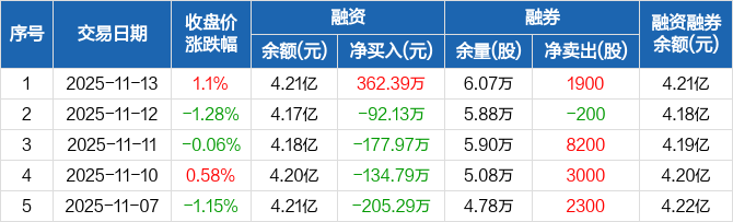 融资方面,当日融资买入1578.84万元,融资偿还1216.46万元,融资净买入362.39万元。融券方面,融券卖出3800股,融券偿还1900股,融券余量6.07万股,融券余额94.57万元。融资融券余额合计4.21亿元。