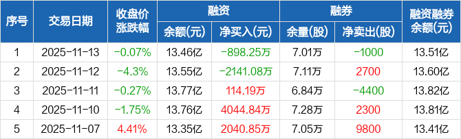 融资方面,当日融资买入7569.14万元,融资偿还8467.39万元,融资净偿还898.25万元。融券方面,融券卖出1700股,融券偿还2700股,融券余量7.01万股,融券余额511.38万元。融资融券余额合计13.51亿元。