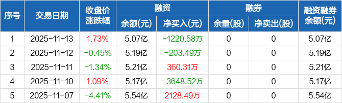 融资方面,当日融资买入3565.16万元,融资偿还4785.74万元,融资净偿还1220.58万元。融券方面,融券卖出0股,融券偿还0股,融券余量0股,融券余额0元。融资融券余额合计5.07亿元。