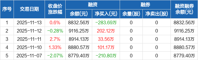 松原安全:融资净偿还283.69万元,融资余额8832.56万元(11-13)