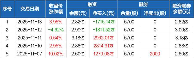 融资方面,当日融资买入8754.79万元,融资偿还1.05亿元,融资净偿还1716.14万元。融券方面,融券卖出0股,融券偿还0股,融券余量6700股,融券余额18.67万元。融资融券余额合计2.82亿元。