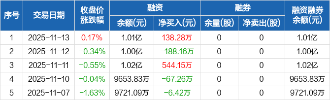 融资方面,当日融资买入502.58万元,融资偿还364.3万元,融资净买入138.28万元。融券方面,融券卖出0股,融券偿还0股,融券余量0股,融券余额0元。融资融券余额合计1.01亿元。
