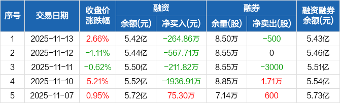 融资方面,当日融资买入3086.24万元,融资偿还3351.1万元,融资净偿还264.86万元,连续4日净偿还累计2981.28万元。融券方面,融券卖出0股,融券偿还500股,融券余量8.5万股,融券余额124.7万元。融资融券余额合计5.43亿元。