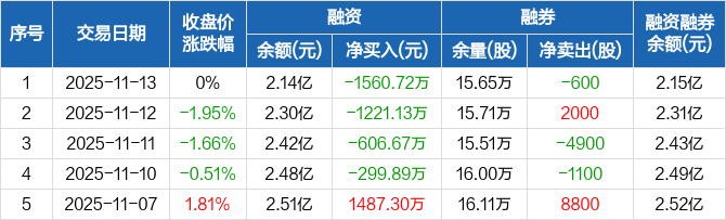 海德股份融资融券信息显示,2025年11月13日融资净偿还1560.72万元;融资余额2.14亿元,较前一日下降6.79%。