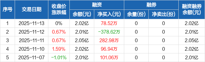 融资方面,当日融资买入335.02万元,融资偿还256.5万元,融资净买入78.52万元。融券方面,融券卖出0份,融券偿还0份,融券余量0份,融券余额0元。融资融券余额合计2.02亿元。