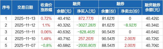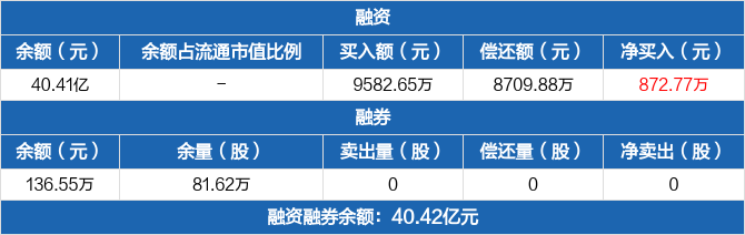 融资方面,当日融资买入9582.65万元,融资偿还8709.88万元,融资净买入872.77万元。融券方面,融券卖出0份,融券偿还0份,融券余量81.62万份,融券余额136.55万元。融资融券余额合计40.42亿元。