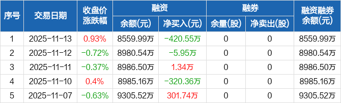 北路智控:融资净偿还420.55万元,融资余额8559.99万元(11-13)