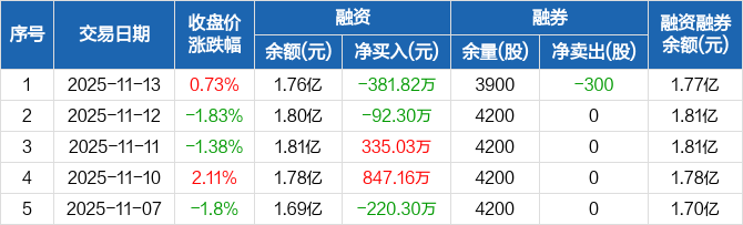融资方面,当日融资买入393.27万元,融资偿还775.09万元,融资净偿还381.82万元。融券方面,融券卖出0股,融券偿还300股,融券余量3900股,融券余额37.67万元。融资融券余额合计1.77亿元。