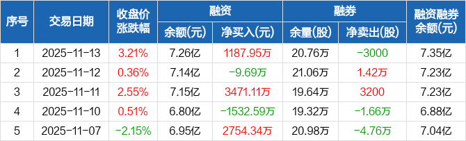 融资方面,当日融资买入6816.37万元,融资偿还5628.43万元,融资净买入1187.95万元。融券方面,融券卖出1200股,融券偿还4200股,融券余量20.76万股,融券余额908.25万元。融资融券余额合计7.35亿元。