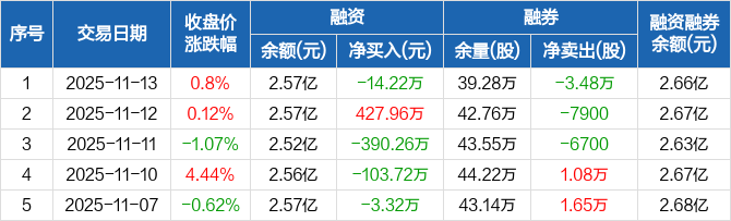百润股份融资融券信息显示,2025年11月13日融资净偿还14.22万元;融资余额2.57亿元,较前一日下降0.06%。