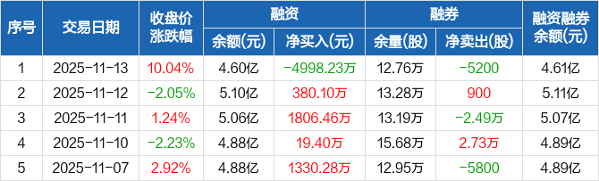融资方面,当日融资买入5400.43万元,融资偿还1.04亿元,融资净偿还4998.23万元,净偿还额创12个月新高。融券方面,融券卖出0股,融券偿还5200股,融券余量12.76万股,融券余额67.12万元。融资融券余额合计4.61亿元。