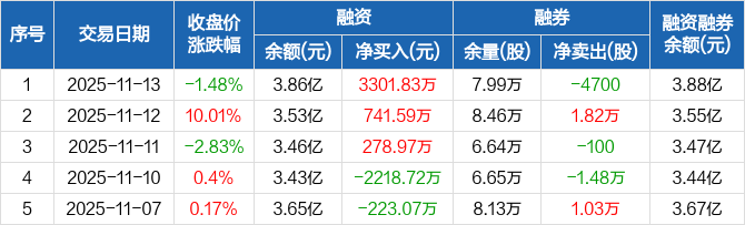 融资方面,当日融资买入1.62亿元,融资偿还1.29亿元,融资净买入3301.83万元,连续3日净买入累计4322.39万元。融券方面,融券卖出100股,融券偿还4800股,融券余量7.99万股,融券余额148.77万元。融资融券余额合计3.88亿元。