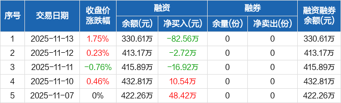 融资方面,当日融资买入79.4万元,融资偿还161.96万元,融资净偿还82.56万元,连续3日净偿还累计102.2万元。融券方面,融券卖出0份,融券偿还0份,融券余量0份,融券余额0元。融资融券余额合计330.61万元。