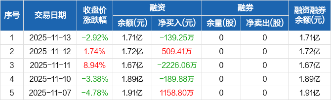融资方面,当日融资买入3812.17万元,融资偿还3951.42万元,融资净偿还139.25万元。融券方面,融券卖出0股,融券偿还0股,融券余量0股,融券余额0元。融资融券余额合计1.71亿元。