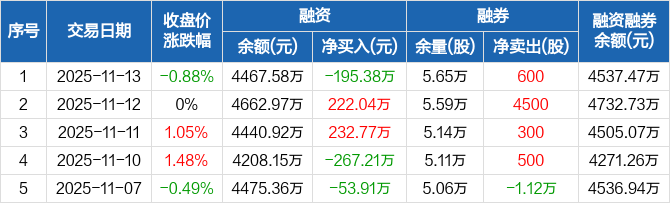 粤高速A:融资净偿还195.38万元,融资余额4467.58万元(11-13)