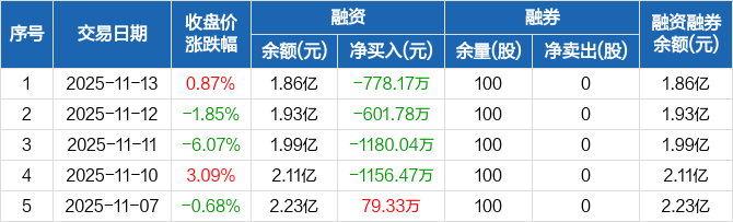 融资方面,当日融资买入347.28万元,融资偿还1125.46万元,融资净偿还778.17万元,连续4日净偿还累计3716.46万元。融券方面,融券卖出0股,融券偿还0股,融券余量100股,融券余额2790元。融资融券余额合计1.86亿元。