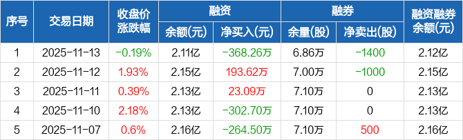 融资方面,当日融资买入496.9万元,融资偿还865.16万元,融资净偿还368.26万元。融券方面,融券卖出100股,融券偿还1500股,融券余量6.86万股,融券余额36.15万元。融资融券余额合计2.12亿元。
