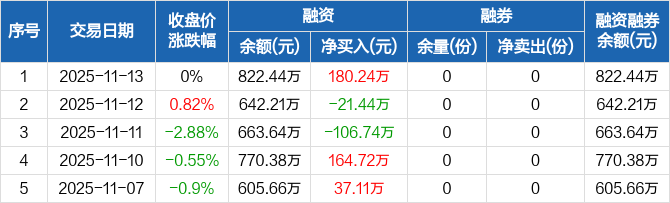 融资方面,当日融资买入426.31万元,融资偿还246.07万元,融资净买入180.24万元。融券方面,融券卖出0份,融券偿还0份,融券余量0份,融券余额0元。融资融券余额合计822.44万元。