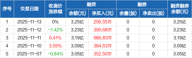 融资方面,当日融资买入954.7万元,融资偿还748.14万元,融资净买入206.55万元,连续9日净买入累计5704.63万元。融券方面,融券卖出0股,融券偿还0股,融券余量0股,融券余额0元。融资融券余额合计3.25亿元。